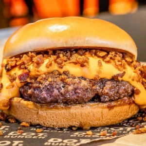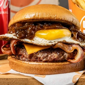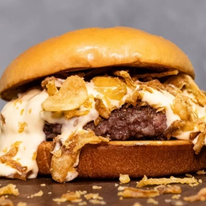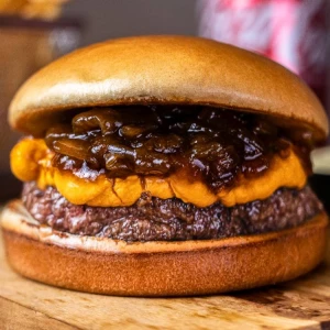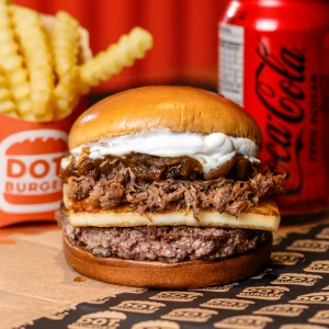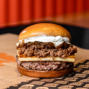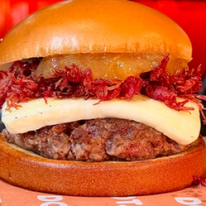 Pão brioche - carne 150g - queijo coalho mergulhado no mel - costela bovina desfiada - cebola caramelizada - maionese Aioli