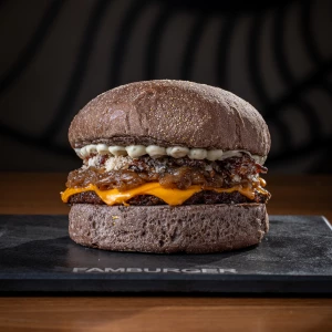 Pão da casa, hambúrguer 100 g, queijo prato, bacon, cebola caramelizada e maionese defumada.