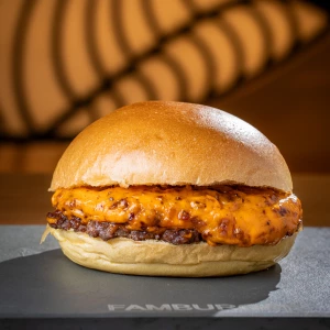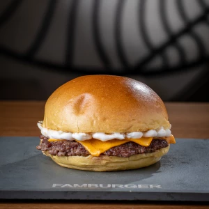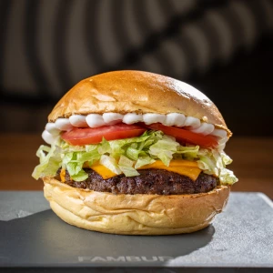 Pão da casa, hambúrguer 100 g, queijo cheddar e maionese defumada.