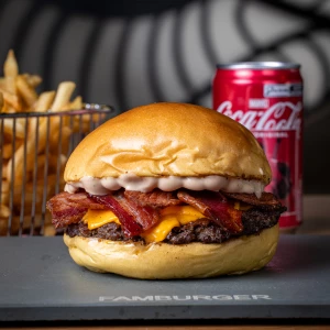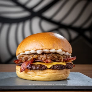 Pão da casa, hambúrguer 100 g, queijo cheddar, bacon e maionese de bacon.
