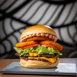 Pão da casa, 2x hambúrguer 100 g, 2x queijo cheddar, 3 anéis de cebola, alface, tomate e maionese de bacon.