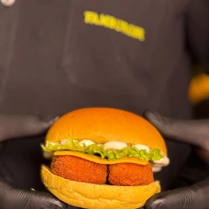 Pão da casa, hambúrguer de pernil empanado 100 g, queijo prato, alface e molho barbecue.