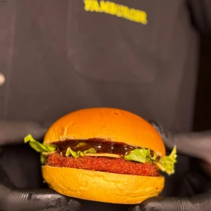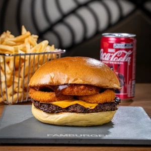 Pão da casa, hambúrguer 100 g, queijo cheddar, 3 anéis de cebola e molho barbecue.