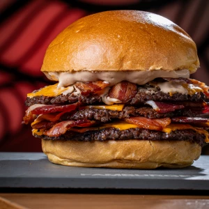 Pão da casa, 3x hambúrguer 100 g, 3x queijo cheddar, 3x bacon e maionese de bacon.