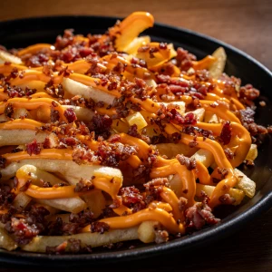 Uma deliciosa e crocante batata frita coberta com muito cheddar e bacon