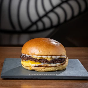 Pão da casa, hambúrguer 100 g, queijo prato, ovo e maionese defumada.