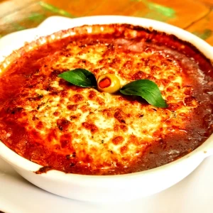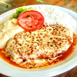 Filé mignon empanado, regado ao molho de tomate caseiro e gratinado com presunto e mussarela. Acompanha arroz e purê de batata