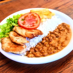 Filé de Frango grelhado. Acompanha arroz, feijão, fritas, alface e tomate