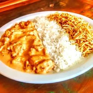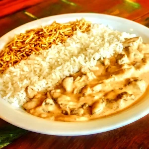 Strogonoff de frango. Acompanha arroz e batalha palha