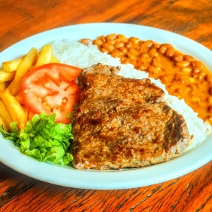 Bife de Boi grelhado. Acompanha arroz, feijão, fritas, alface e tomate