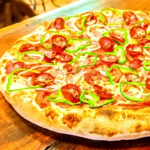 Mussarela, champignon, palmito, azeitona, milho, tomate, pimentão, cebola
