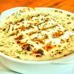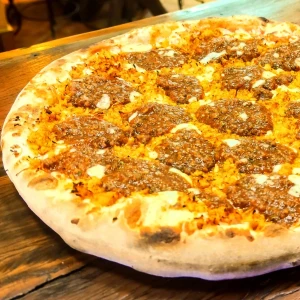 Molho de tomate, mussarela, alho poró, cebola, cream chesse, azeitona recheada, orégano