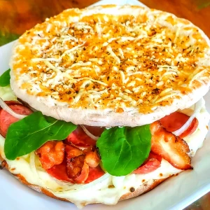 Mussarela, hambúrguer bovino especial, cheddar, bacon, cebola, rúcula
