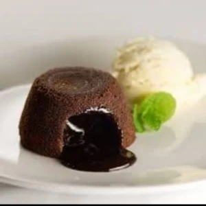 Bolinho de chocolate com casca crocante e recheio cremoso servido com sorvete de creme