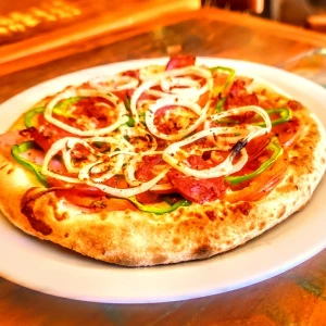 Molho de tomate, mussarela, calabresa, cebola, orégano
