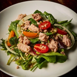 Mix de verdes, lascas de atum, lâminas de cebola, cevadinha e tomatinhos coloridos