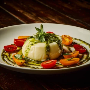 Mozzarella de búfala cremosa, típica da região da puglia, servida com pesto de manjericão.